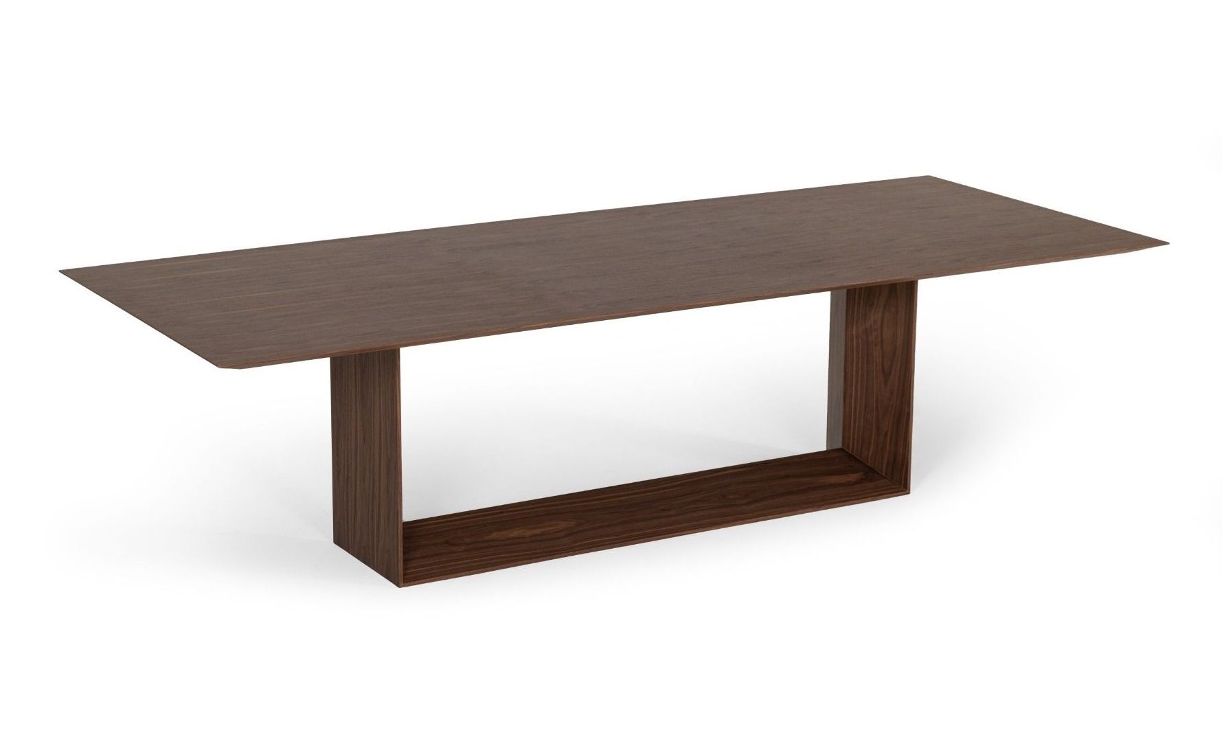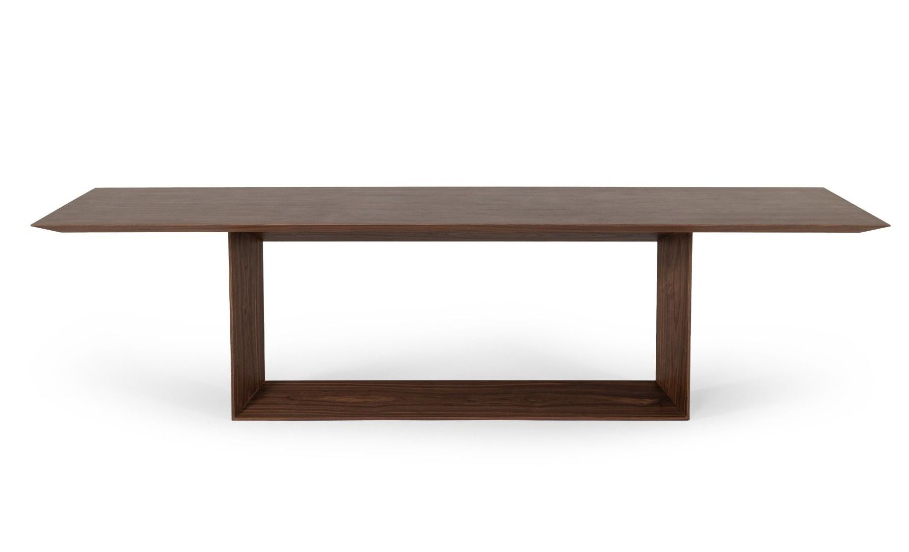 Bring elegance and grandeur to your dining room with the Modrest Channa Modern Walnut Dining Table. Featuring a rich walnut veneer finish, this table’s rectangular top is enhanced by beveled edges that add a refined touch. The sturdy U-shaped base gives it strong architectural presence while ensuring stability.