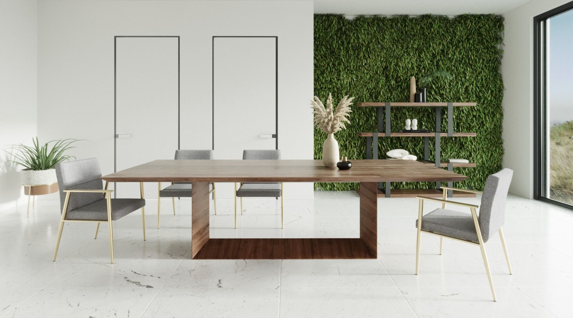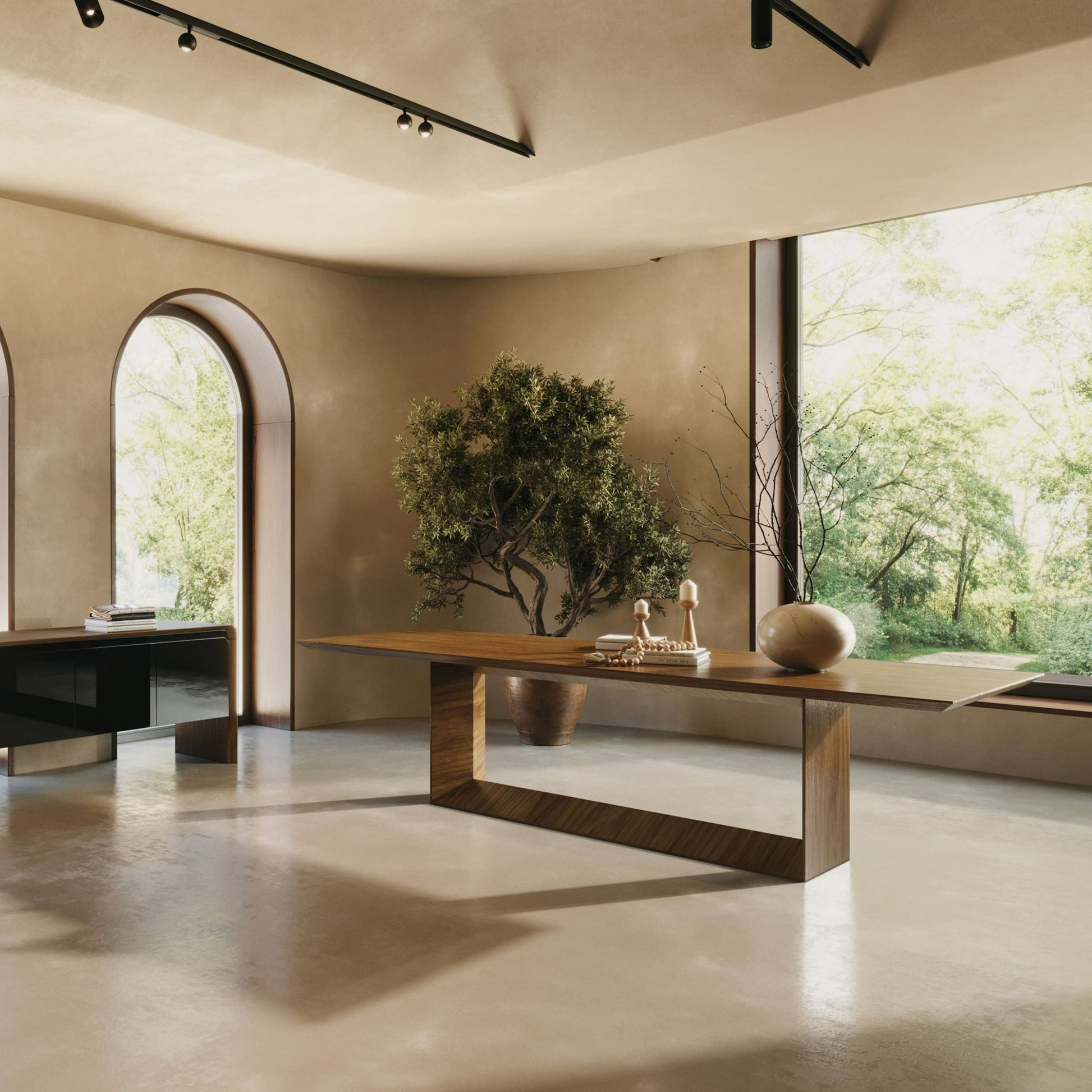 “Large walnut veneer dining table with contemporary u-shaped support base