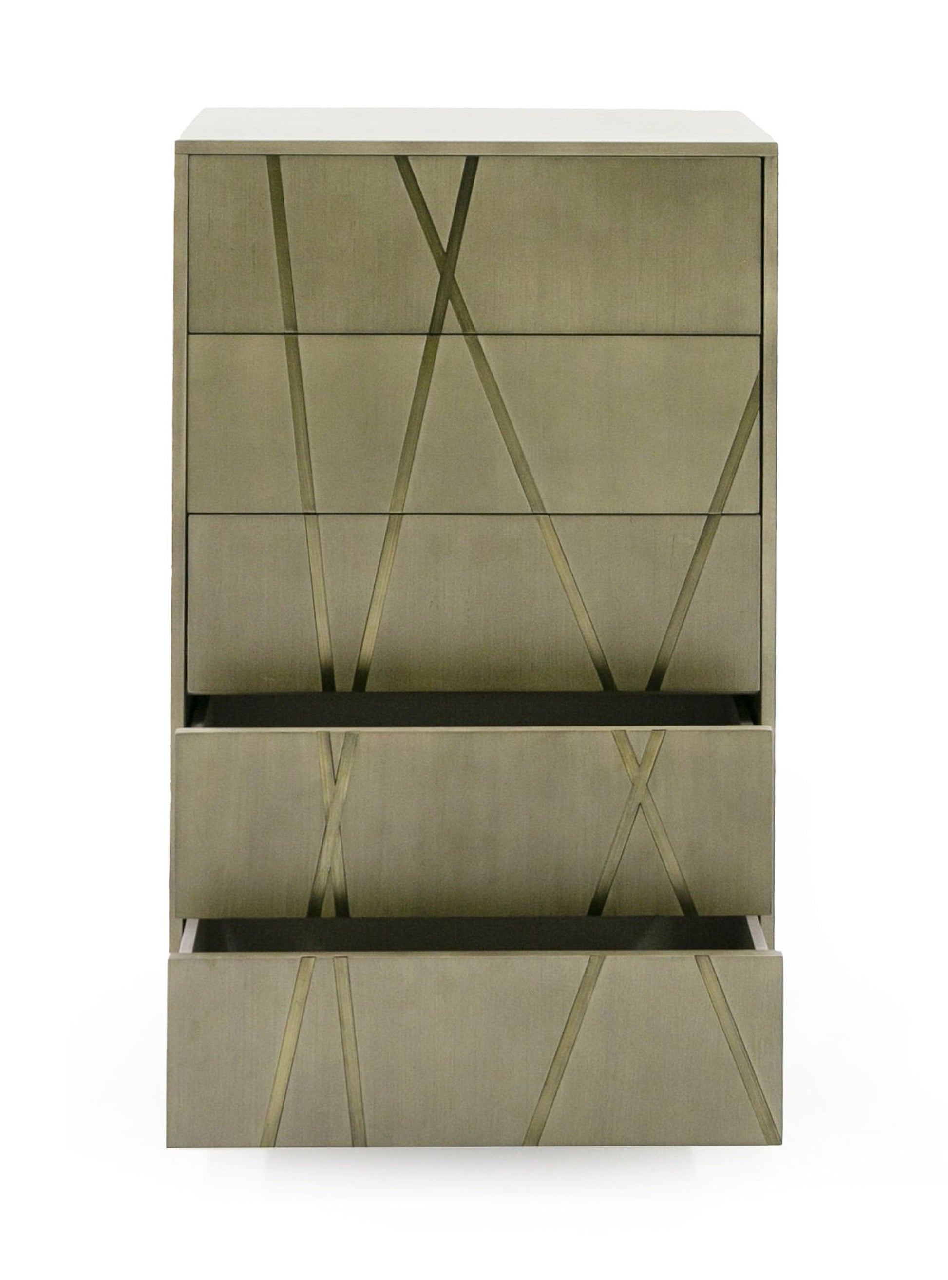 Bringing grace and style into your bedroom is the Modrest Nixa Modern Birch & Bronze Chest. Built to provide ample storage, it features an impeccable birch wood finish features with five soft-closing drawers. To establish contrast, crisscrossed svelte brushed bronze painted accents adorn the front, enhancing its allure. Delivered to you fully assembled, this modern birch & bronze chest stands on a robust support.