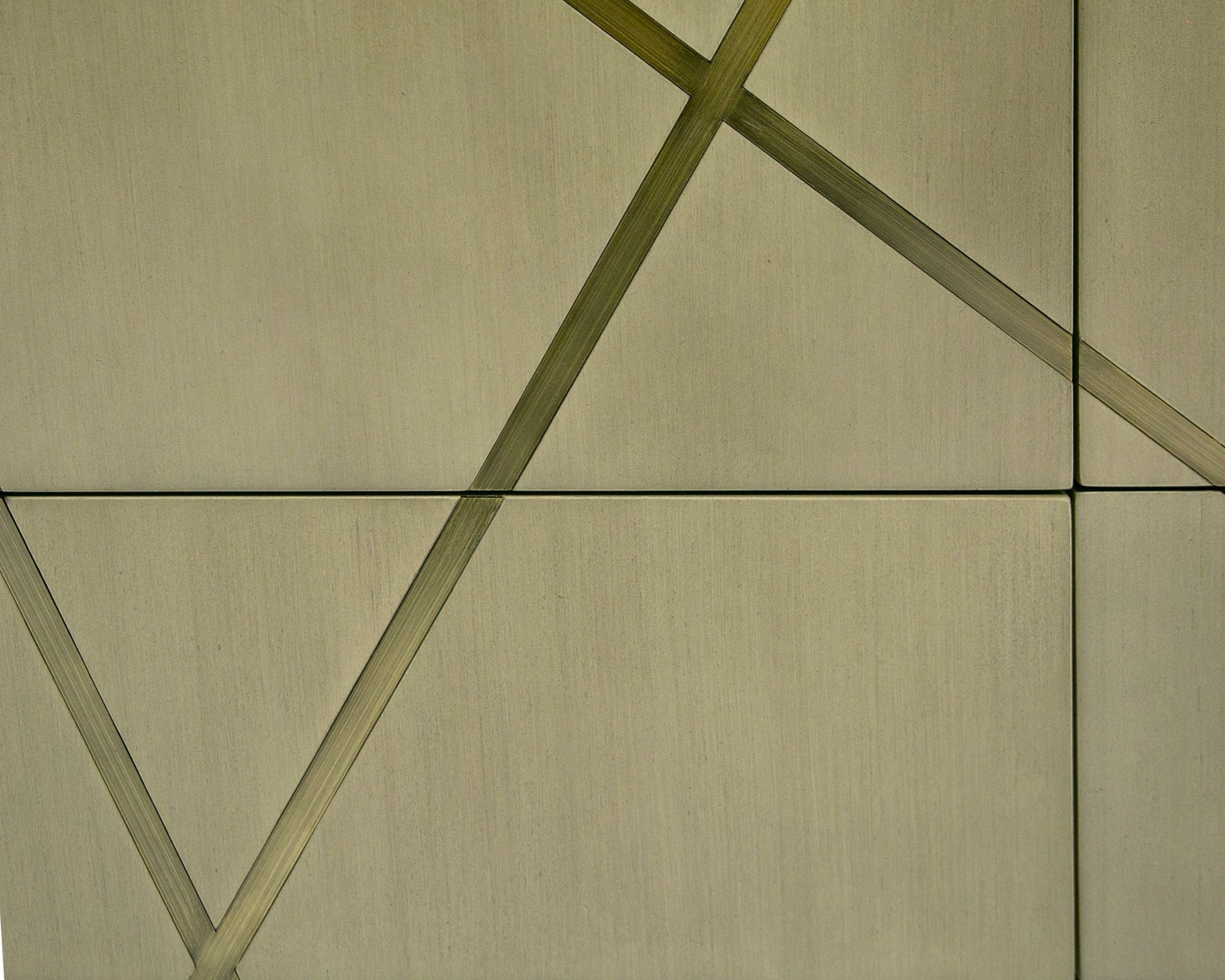 • Anti-White Wash Birch Veneer • Brushed Bronze painted accents (crisscrossed) on front