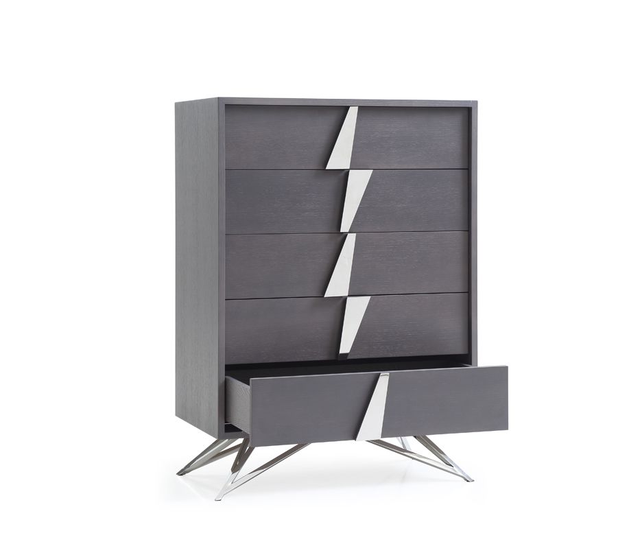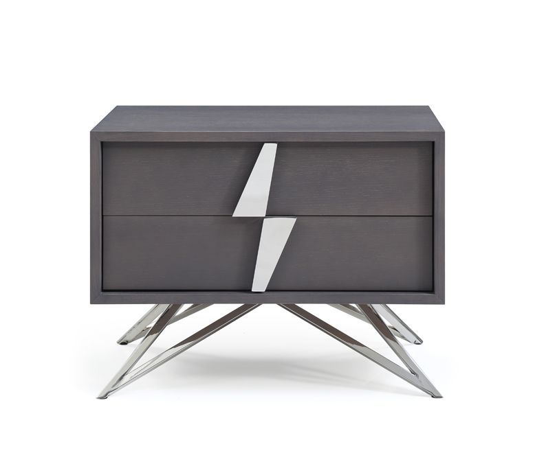 Elevate your bedroom décor with the Modrest Nicola Modern Grey Oak & Stainless Steel Bed. This contemporary bed blends the warmth of grey oak veneer with clean, reflective stainless steel accents for contrast. The medium-height headboard flows down to the floor, forming part of the structure, complemented by slanted V-shape stainless steel legs for both style and stability.