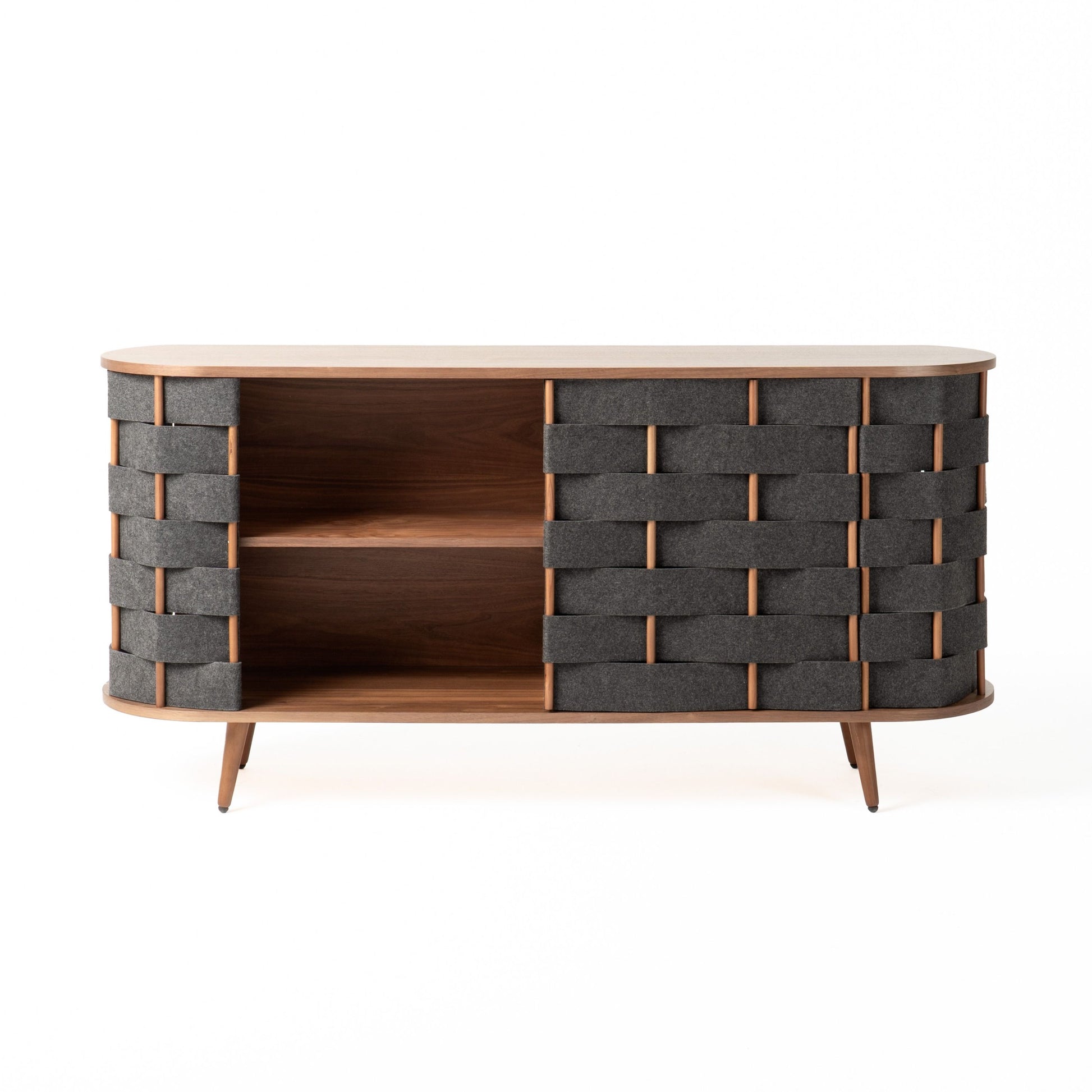 Sophisticated Walnut Buffet with Grey Upholstery. The Sheridan Sideboard-Buffet will make a wonderful addition to your dining room! It combines the three elements of good taste: attractive to the eye, made with excellent quality materials and multifunctional. The grey woven fabric and Walnut Wood Veneer finish bring a rustic and earthly aesthetic to the room and the combination of sliding and cabinet provide ample space for your dining accessories such as platters, glassware and more. The Sheridan collection includes a matching dining table and dining chairs.